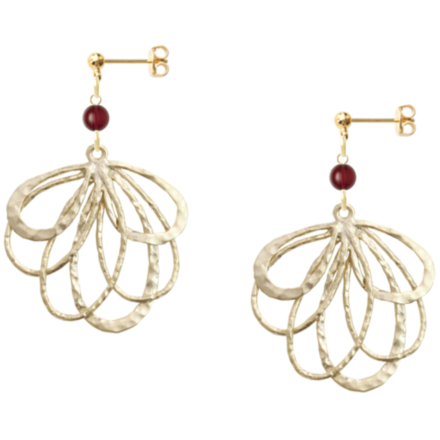 These pierced earrings feature deep red garnet, gently swaying beneath a golden orbit-shaped motif — a symbol of returning to your own center.